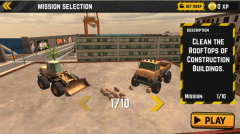 2、任务描述为清理建筑屋顶,当前进度为1/10。点击PLAY按钮开始游戏,游戏中将展示装载机和卡车,并呈现一个建筑屋顶的施工场景。