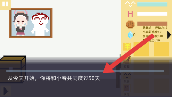 2、在第一天的显示中,根据文字提示,从今天起你将与小春共同度过50天。画面顶部会有像素风格的人物画像等元素。