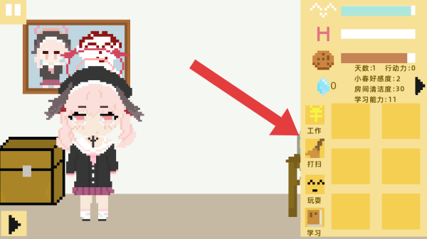3、根据右侧毕竟低的数值来进行工作,还有打扫、玩耍、学习等操作选项,以及背景中的像素画像等元素。