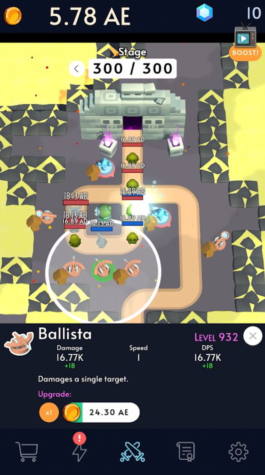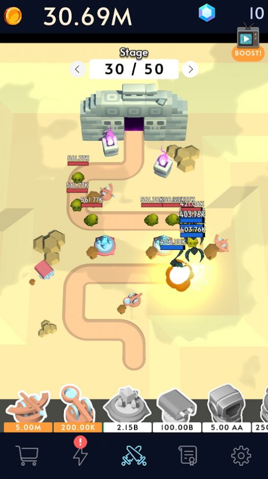 2、超多不同属性的防御塔自由的选择使用,击杀怪物,掉落金钱,提升防御塔的威力。