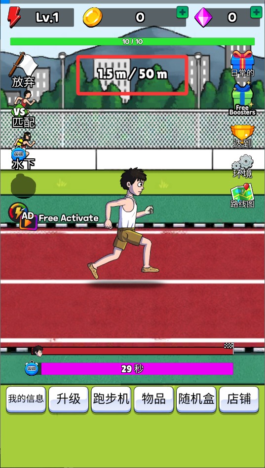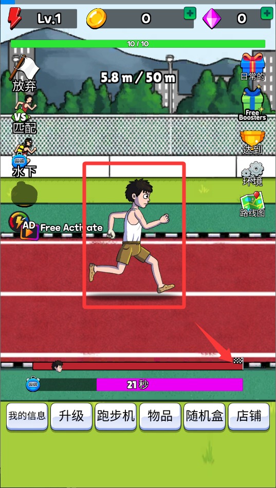1、基础竞速模式考验节奏掌控,点击屏幕驱动角色奔跑。把握精准点击频率,在跑步机上突破极限速度创造纪录。