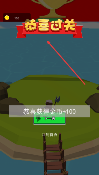 3、当界面显示过关字样时,会呈现获得的奖励等信息,可选择进入下一关继续挑战,或回到首页重新选择关卡。