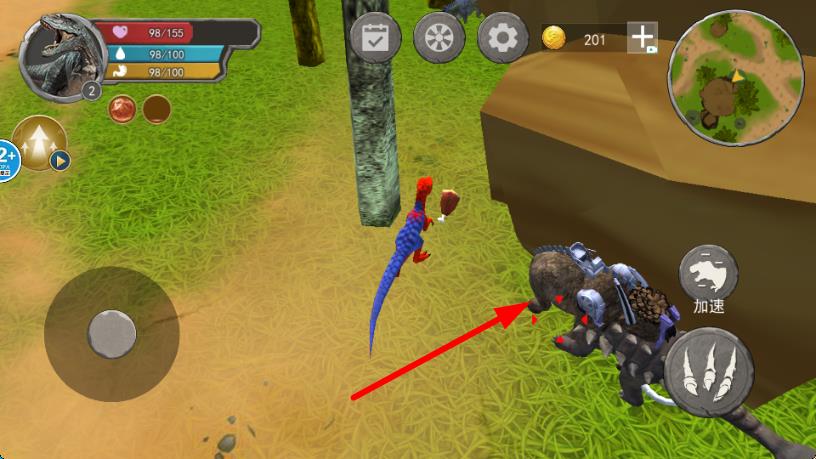 2、在开放世界中自由探索,根据恐龙食性寻找对应的食物来源,通过捕猎或采集获取能量;遭遇其他恐龙时,选择战斗击败对手获取成长经验。