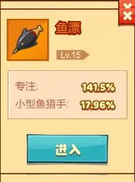 4、最后要讲的就是鱼漂啦,它具有提升专注度的独特属性。要是小伙伴们不太明白,小编举个例子大家就清楚了。咱们钓鱼时,最常碰到两种情况:好不容易等来大鱼,结果不是鱼线断了,就是鱼跑了。相信小伙伴们对这种情况肯定不陌生,当时小编都快气坏了。其实,只要提升鱼漂等级,就能避免鱼跑的状况,再搭配相应等级的鱼线,如此一来,就能提高钓到鱼的概率啦。