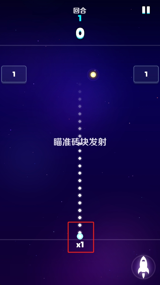 1、首先,我们将底部的蓝色小球对准上方的砖块,调整好发射的角度后,点击右下角的火箭图标进行发射,利用弹道来击碎砖块。