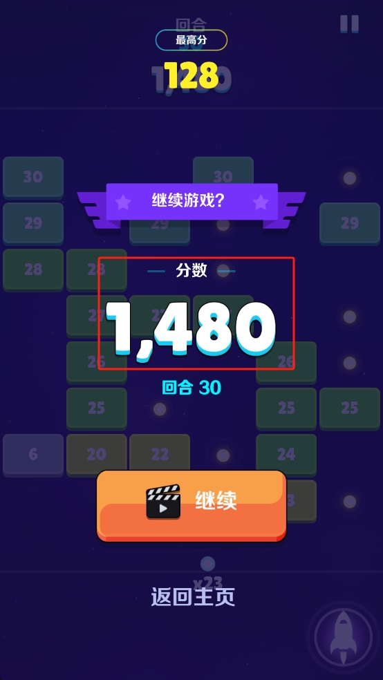 3、回合结束后,屏幕上会显示分数1480,这时你可以点击橙色的继续按钮来延续游戏或返回主页。如果想要冲击更高分数,可以采用反弹策略再次挑战。