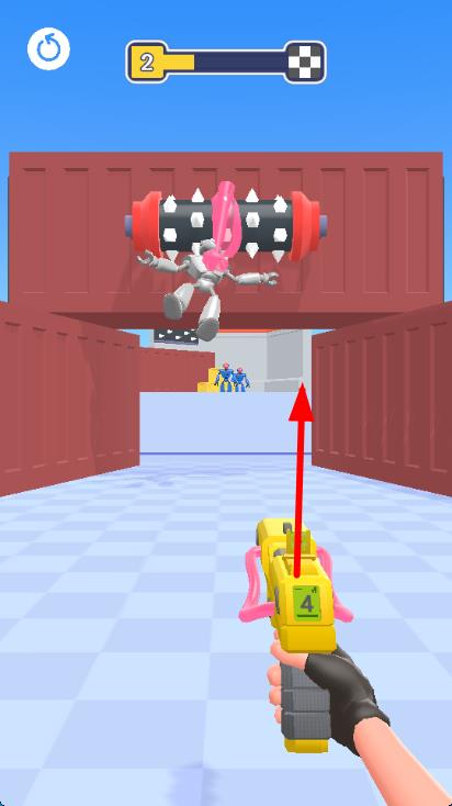1进入游戏后挑选关卡,通过滑动屏幕来改变角色的视角,对准前方出现的敌人,点击射击键进行基础攻击。