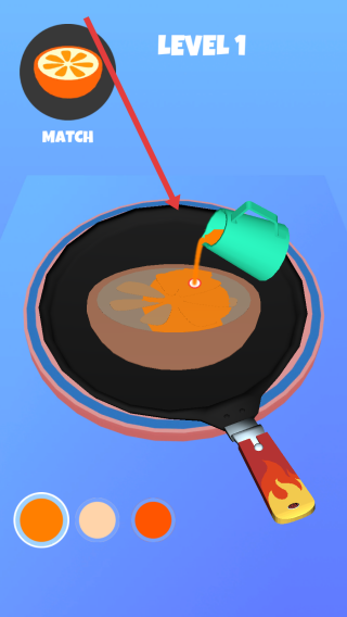 2、在第一关,需要根据橙子图案提示,选择对应颜色的水壶,不断将颜料倒入煎饼模具染色。