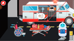 2、在救护车场景中,找到红色方框内的医疗物品图标,点击该图标,然后对躺在担架上的角色进行医疗处理,完成这一步骤的任务。