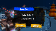 3、当玩家被僵尸击败后,游戏结束,屏幕上会显示总击杀数和最高得分。玩家可以选择RESTART重新开始游戏,或者点击HOME返回主菜单。