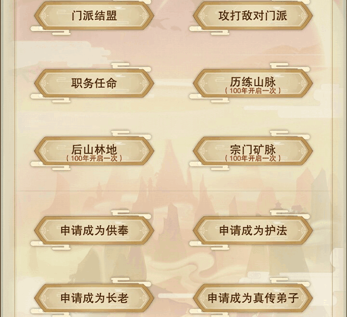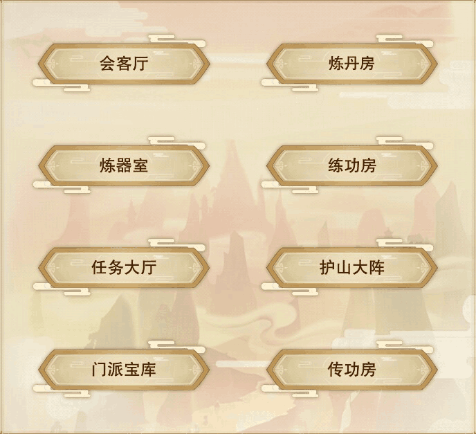 每一个按钮图标,对应门派内的各种建筑,可以按自己的需求进入各种建筑中活动。