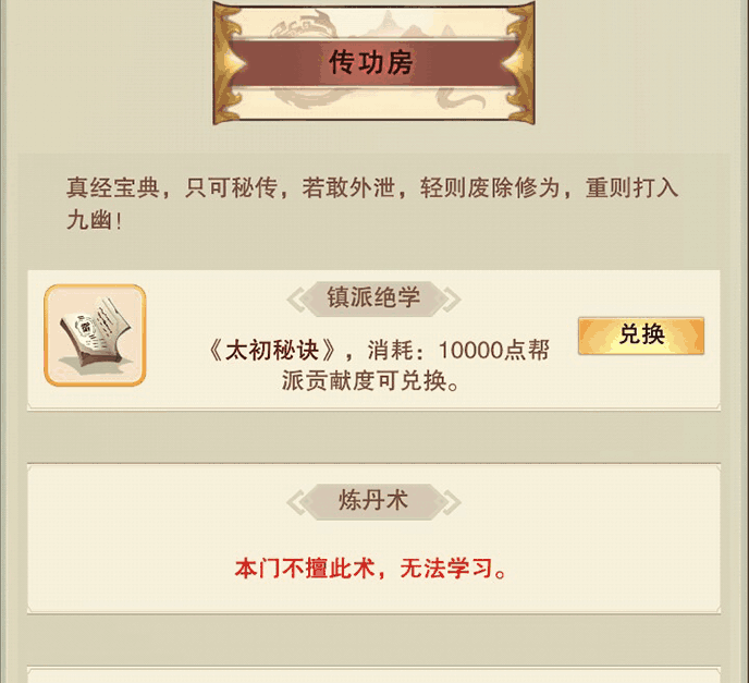 传功房内可以查看本门派是否能学习炼丹,炼器,阵法,有无门派秘籍。一般来说有秘籍的门派才值得在内常驻,如果当前门派全部毕业,建议选择有炼丹术的门派挂丹方。
