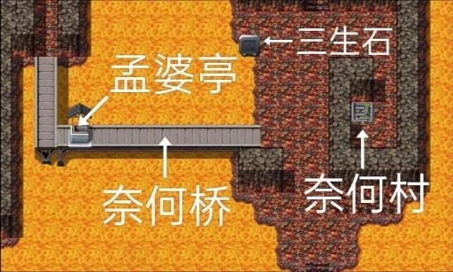 关右边山洞拿蛇矛(十分重要)。出村过奈何桥路过孟婆亭,过完桥就不能回去。