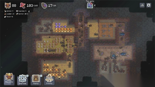 2、巢穴的建造与升级:起始于基础蚁穴,随后循序渐进地解锁诸如土壤加固、通风系统等各类建筑模块,进而构建出多层立体式的巢穴,以此增强蚁群的资源存储能力以及防御强度。