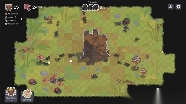 1、间接管理操控设计:不再采用直接操控蚂蚁的传统方式,而是通过生成具有特定功能的蚂蚁,像觅食蚁、战斗蚁,以及升级族群科技树等途径来进行宏观管理,给予策略决策更大的自由度。