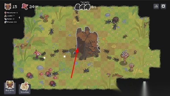 1. 刚进入游戏,指挥蚁群在起始区域爬行,引领工蚁对周边环境展开探索,寻觅四处散落的食物资源,以此为族群的生存筑牢物质根基。