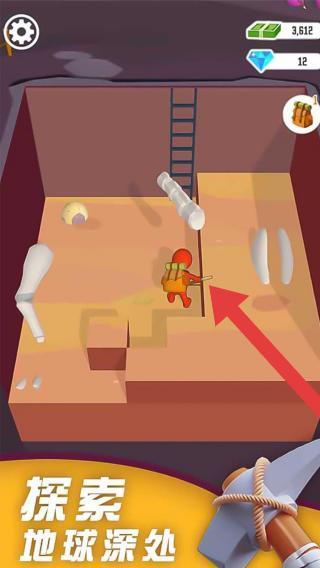 3、展示角色在地下环境中探险,包含骨骼化石等元素,并结合“探索地球深处”的文字描述。玩家可以体验考古挖掘和收集化石的乐趣,同时还能经营和发展相关的考古事业。