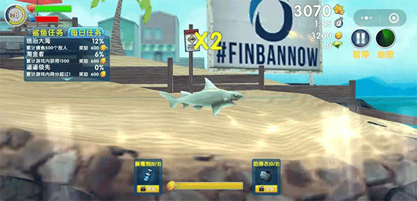 完成五十个任务,探寻宝物获取金币与宝石,以此来升级你的鲨鱼,或是购置特殊救生道具。逐步解锁更多水下凶猛野兽,如灰鲭鲨、锤头鲨、虎鲨,以及无敌的大白鲨!