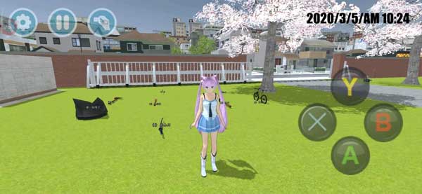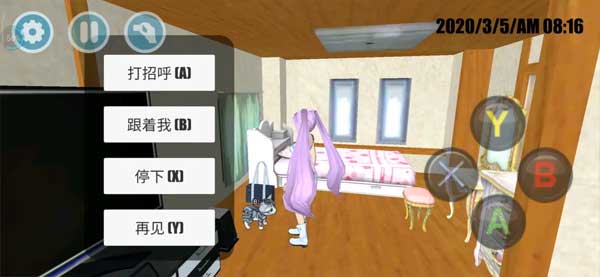 2、人物游戏内长相与编辑时有些许不同。一进入游戏就出现在女主的家。女主的家很少女,家里有一些家具、一只小猫和一个包包,可以跟小猫说话,包包可以带去学校上课。游戏里面和学生以及猫说话的内容有四个选项:打招呼、跟我来、停住和再见;和老师说话只有打招呼和再见;和男主的话:接吻、跟我来、停住和再见。家里可以换衣服。