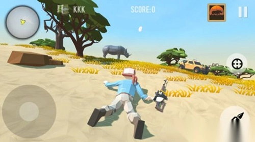 3、避开“犀牛”!如果被撞倒在地,点击左侧移动,绕着树跑,3秒后可以摆脱犀牛。每猎杀10只犀牛,可以获得一把新枪(狙击枪+5),并且分数翻倍。