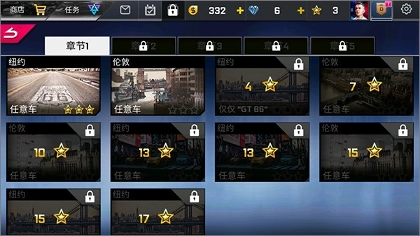 6、游戏分为五大章节,每章设有不同城市赛道,完成当前城市赛事后将开启下一段街头竞速旅程。