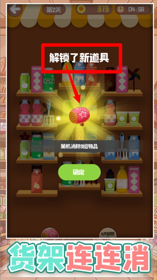 1.将物品拖动:把物品拖进货架槽,三个相同即可成功消除。