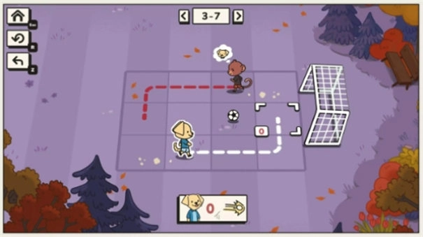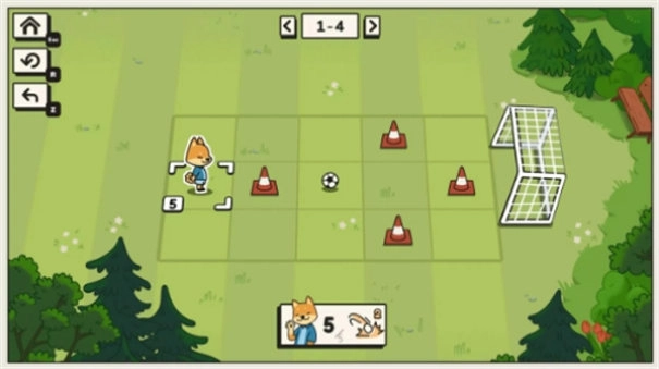 4、开启第四关,直接将球踢到前面,记住角色移动有步数限制,一旦步数耗光,还没有将球踢入网中闯关就失败了。