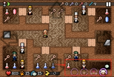 3、左上角显示药水补充状态,上方显示已获取的钥匙数量为0。中间位置显示生命值为800,步数为15。右下方有四个圆圈代表技能,根据需要点击使用。