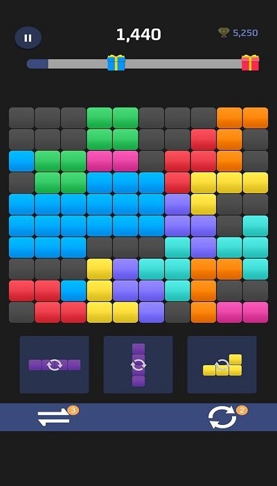 1每轮玩家可以从下方选取三个不同形状的方块,并依次将它们放置在棋盘上的任意位置。