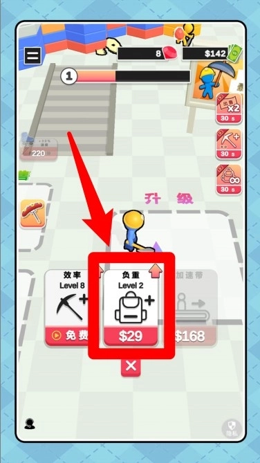 1.点击升级负重图标:增加背包容量,减少来回搬运次数更轻松。