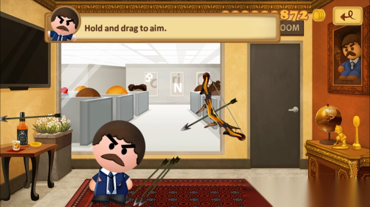 2、在游戏过程中,可以从丰富的武器库中随时挑选弓箭、烟花等道具,通过点击并拖动武器来对老板进行连击,以此赚取金币解锁更多道具。