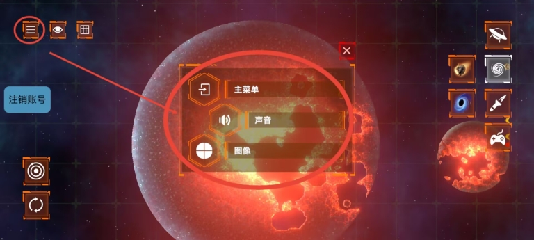 3、点击菜单按钮进入暂停界面后,可以进行返回主界面、调节音效和画面设置等系统操作。