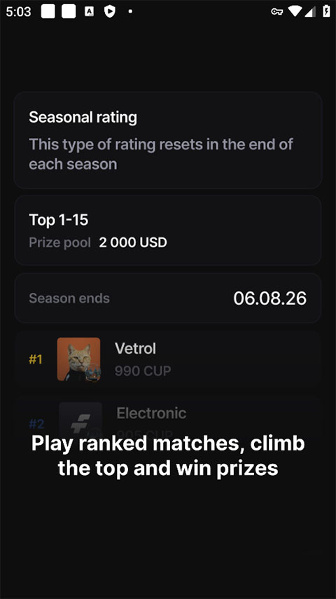 - 在应用程序内参与我们合作伙伴举办的锦标赛,角逐大奖,于电子竞技领域展现自身实力。