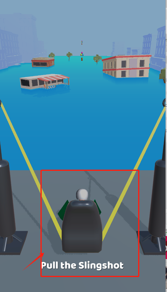 1、点击拉动弹弓的按钮,积蓄力量后将人物发射到被洪水淹没的城市上空。
