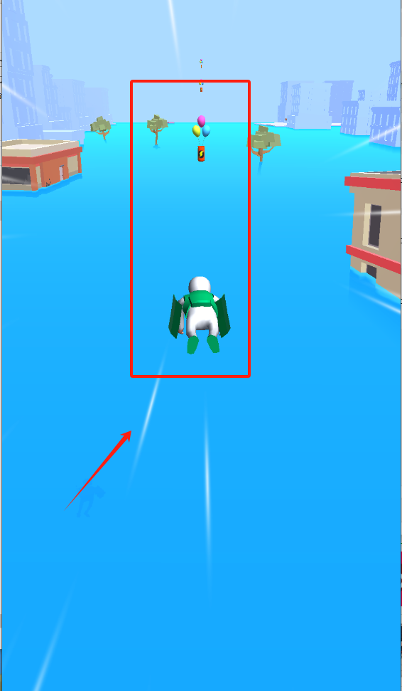2、操控绿翅膀人物在空中飞行,收集红色框内的彩色气球和道具物品。