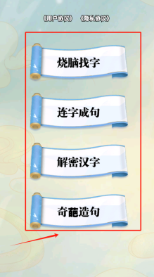 2、从四个卷轴选项中选择一个游戏模式,如烧脑找字。