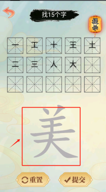 3、在5x5方格中找出隐藏的15个汉字,点击提示或提交。