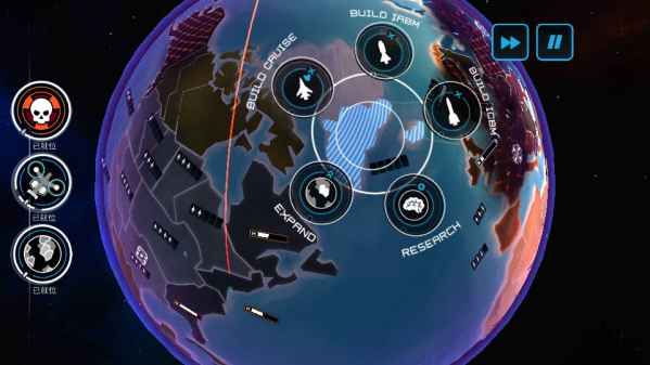 首先,你会有几秒钟的时间来观察地球上其余的核势力(如果有侦查科技的话可以无视),然后会进入一片迷雾,只会看见你的领土和其周边地区。解释一下游戏中图标,首先你得点击一块自己的领土。