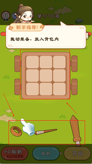 1点击屏幕选取背包位置,将武器拖至合适的格子中,系统会在战斗时自动施放相应的攻击效果。