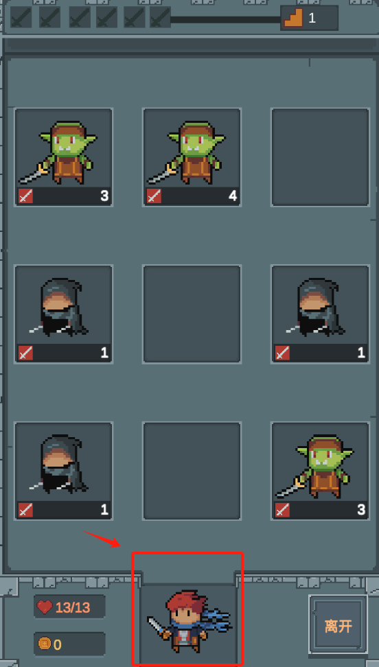 2、选择九宫格中的角色组成队伍,确认血量金币无误后点击离开返回。