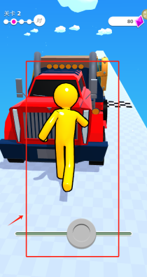 3、旋转灰色圆盘,操控黄小人站在红框中,同时避开正在行驶的红色大卡车前进。