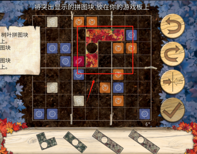 3、按照提示把突出显示的树叶拼图块拖到游戏板空缺处。