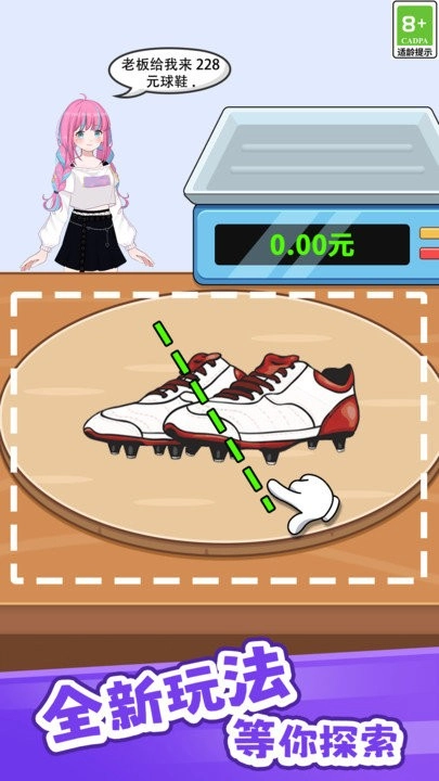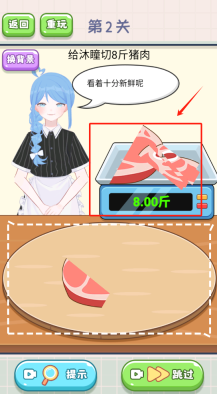 3、观察左侧女孩和右侧秤上猪肉重量,点击案板上的肉块切割,需切出8斤给沐瞳。