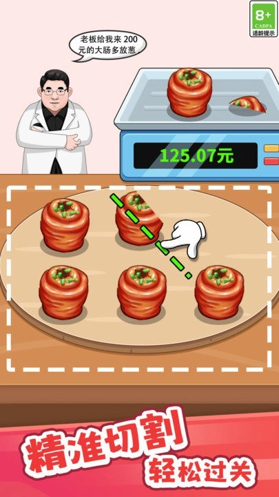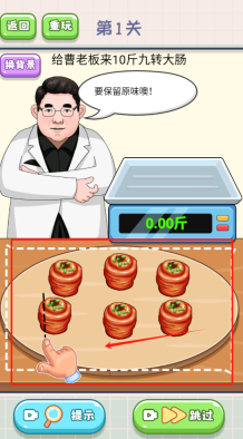 2、点击圆形砧板上的九转大肠进行选取,用手指拖动切割,目标是为曹老板称出10斤。