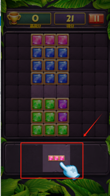 1、底部红框粉色宝石消除,争取获得更高分数,当前得分21最高分0。