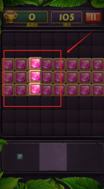 2、观察红框内三个相连粉色宝石,点击消除可得分,当前得分105最高分0。