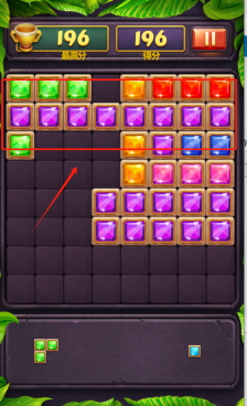 3、选择下方待选宝石放入棋盘,消除相连同色宝石块,当前得分196最高分196。