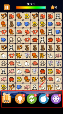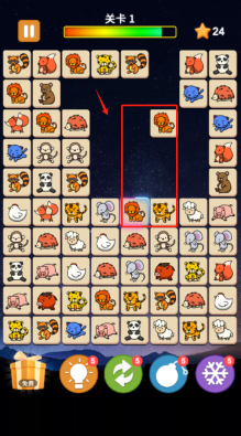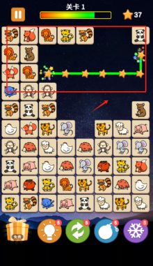 3、通过滑动来连接相同的动物,红线标出了已经消除的路径,使用道具图标可以帮助你更快地通关。