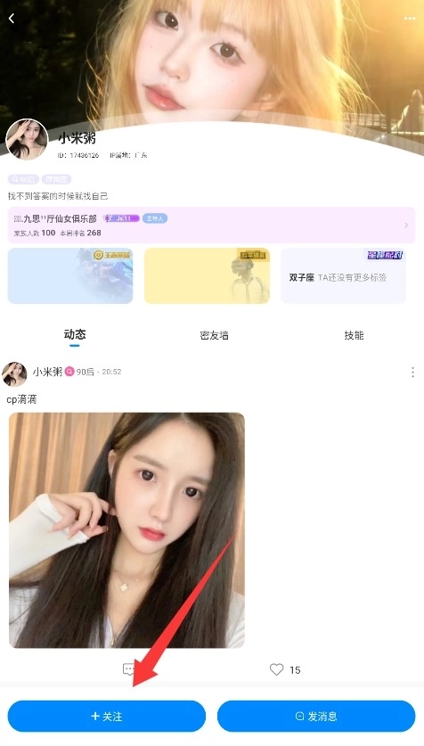 3、进入他人主页后点击左下角关注按钮,当对方回关后即可建立好友关系,开始互动交流。
