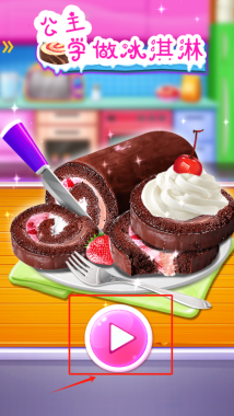 1、点粉色播放按钮开始游戏,跟着公主学做巧克力奶油草莓冰淇淋。